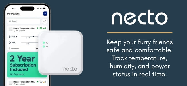 Necto pet temperature monitors offer reliable temperature and power monitoring with built-in cellular. No WiFi required. Set it up once. Stay informed, every day. RVO Members receive 15% discount on Necto Pet Monitors.